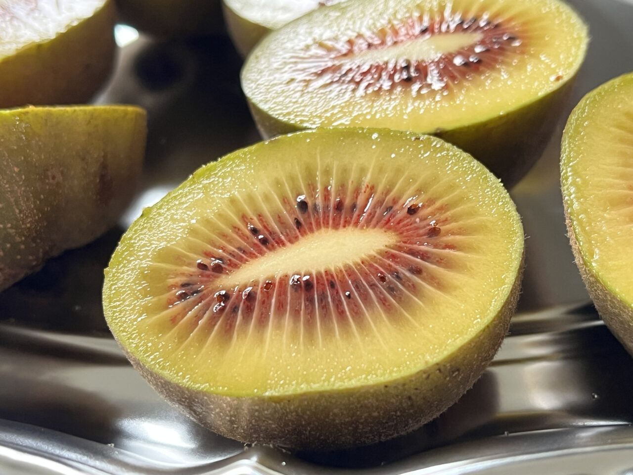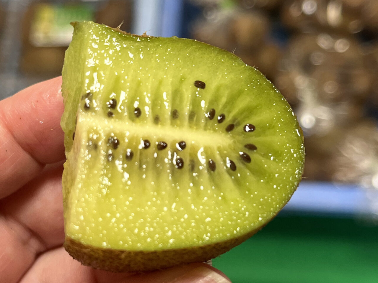 「キウイって酸っぱい」「舌がピリピリするから苦手」という人の概念をくつがえす美味しさです。 また、直売所には「レインボーキウイ」も並んでいました。こちらは表面の毛が少なく、中心がほんのり赤く染まるのが特徴。カットした断面の美しさから、ケーキやタルトのデコレーションにもぴったりです。