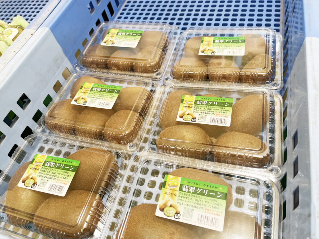 店内にはずらりと、つややかなキウイフルーツが並びます。手のひらにずっしりと感じる大玉タイプから、食べやすい中玉サイズ、そして小ぶりでお得な袋入りまで種類豊富。贈り物にも、自宅用にもぴったりです。 「翡翠グリーン」は名前のとおり、翡翠を思わせるみずみずしい深い緑色が特徴。さらに驚くのはその味わい。大きい果実ほど糖度が高く、キウイ特有のイガイガする酸味がほとんどありません。
