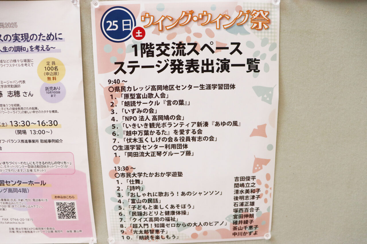 県民芸術文化祭2025の協賛事業として、「ウイング・ウイング祭」が10月24日(金)・25日(土)の2日間、高岡市生涯学習センター(ウイング・ウイング高岡)で開催されます。音楽公演や講座、体験イベントなど、多彩なプログラムが館内各所で行われ、どなたでも無料で参加することができます(一部は事前申込や材料費が必要です)。