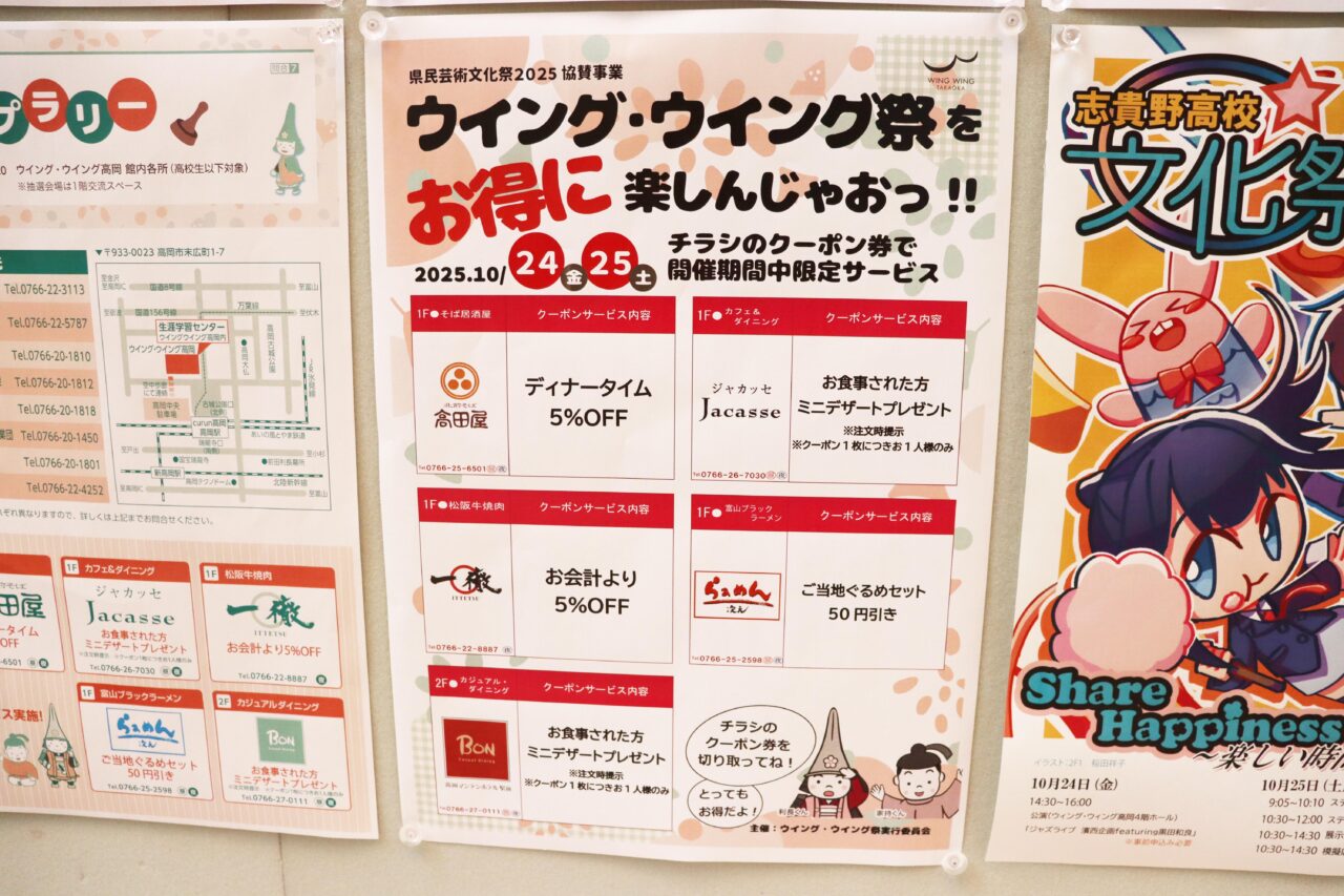 25日(土)には高校生以下を対象としたスタンプラリーも開催され、館内を巡ってスタンプを集めると抽選会に参加することができます。また、期間中はウイング・ウイング高岡内の飲食店で使える特別クーポンも配布され、そば処やカフェなどでお得なサービスが受けられます。