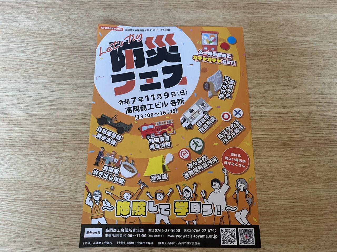 地域の防災意識を高めようと、「Let’s Try 防災フェス」が11月9日(日)、高岡商工ビルで開かれます。主催は高岡商工会議所青年部。防災を体験して学ぶをテーマに、子どもから大人まで楽しめる多彩なプログラムが用意されています。開催時間は13時から16時15分まで。