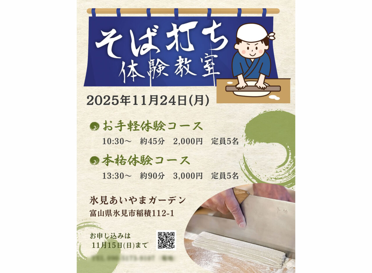 氷見市の氷見あいやまガーデンで、そば打ち体験教室が2025年11月24日(月)に開催されます。自分の手でそばを打つ楽しさを味わえる人気企画で、「お手軽体験コース」と「本格体験コース」の2種類が用意されています。