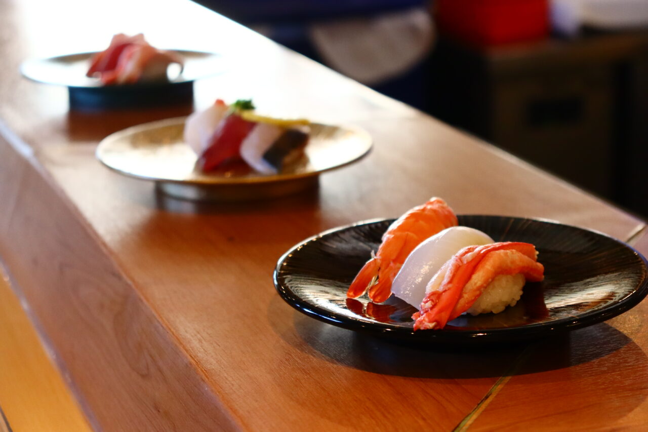 富山県の「寿司といえば、富山」ブランディングプロジェクトと連動し、県内23人の職人・作家が手がけた一点ものの「工芸寿司皿 SUSHI PLATE」を使用。漆芸、彫金、金属着色、ガラスなど多彩な技が光る23名の作家による44種類の皿が制作されました