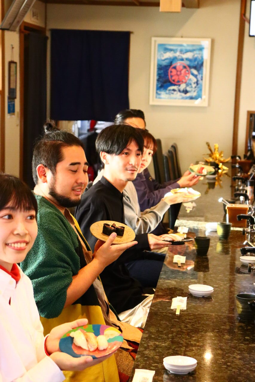 作家・職人を代表し、5名が自作の皿で、粋鮨自慢の寿司を楽しみました。その皿のデザインやストーリーに合わせて、粋鮨の職人さんが寿司ネタを握りました。
