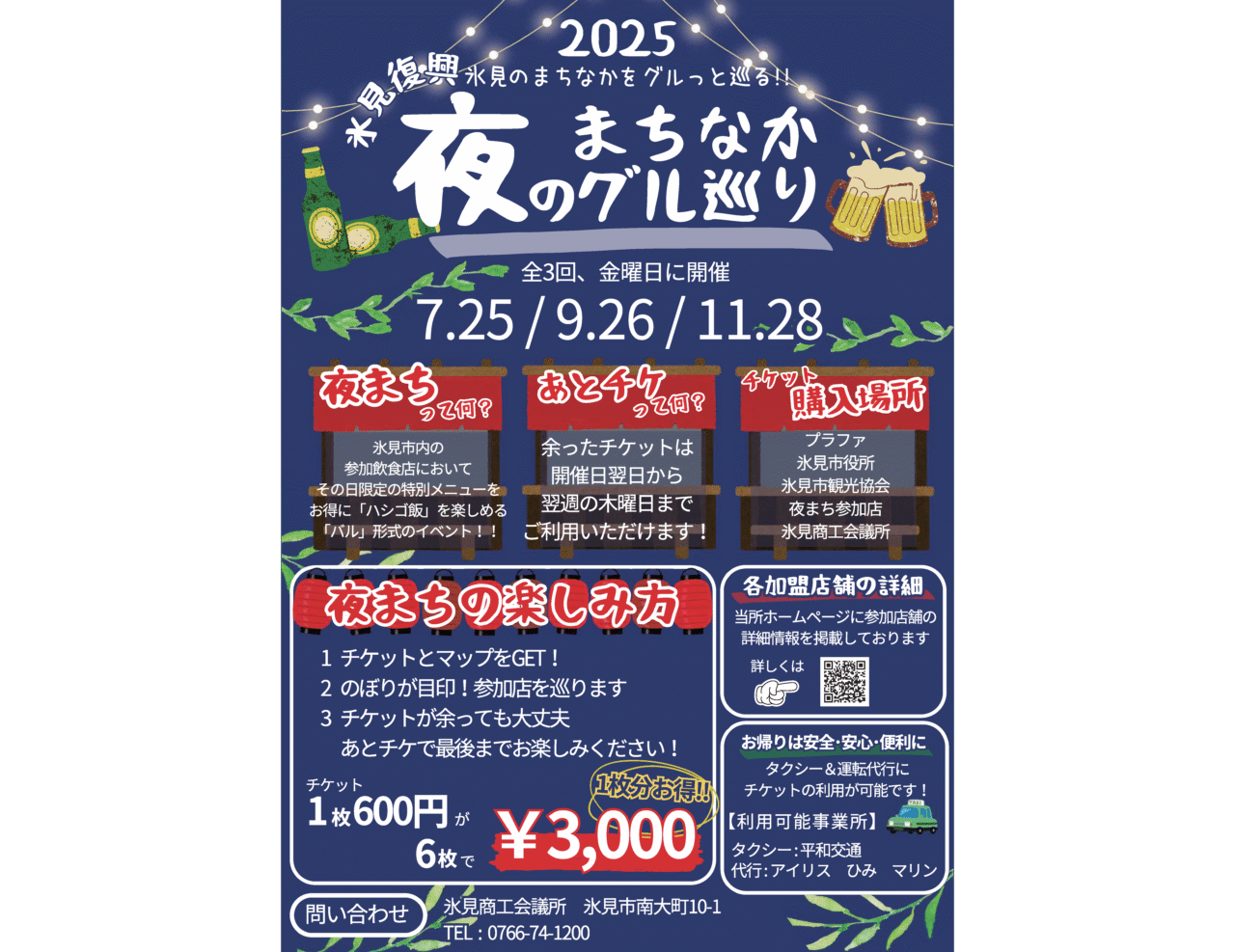 詳しい参加店舗の情報は、氷見商工会議所のホームページで公開される見込みです。タクシーや運転代行も利用可能で、安心・安全にまちなかの夜を楽しめます。