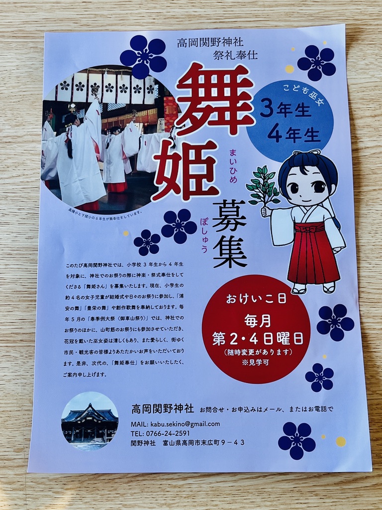 【高岡市】高岡關野神社が「舞姫」を募集 市内の小学3・4年生対象に祭礼奉仕