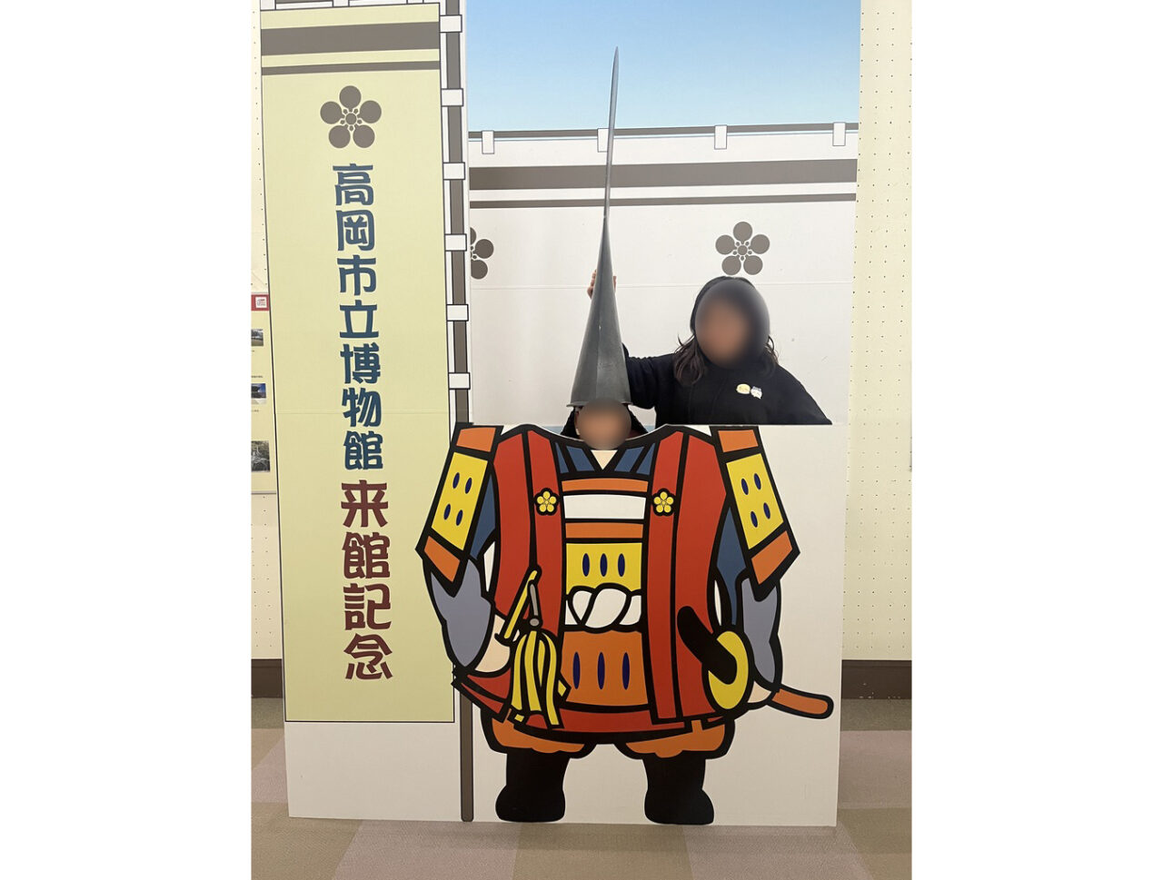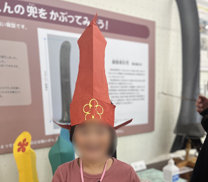 高岡市立博物館ではトレードマークの銀鯰尾形兜を模した紙製の兜をかぶる体験ができます。紙製でも意外にバランスがとりにくいのだとか。