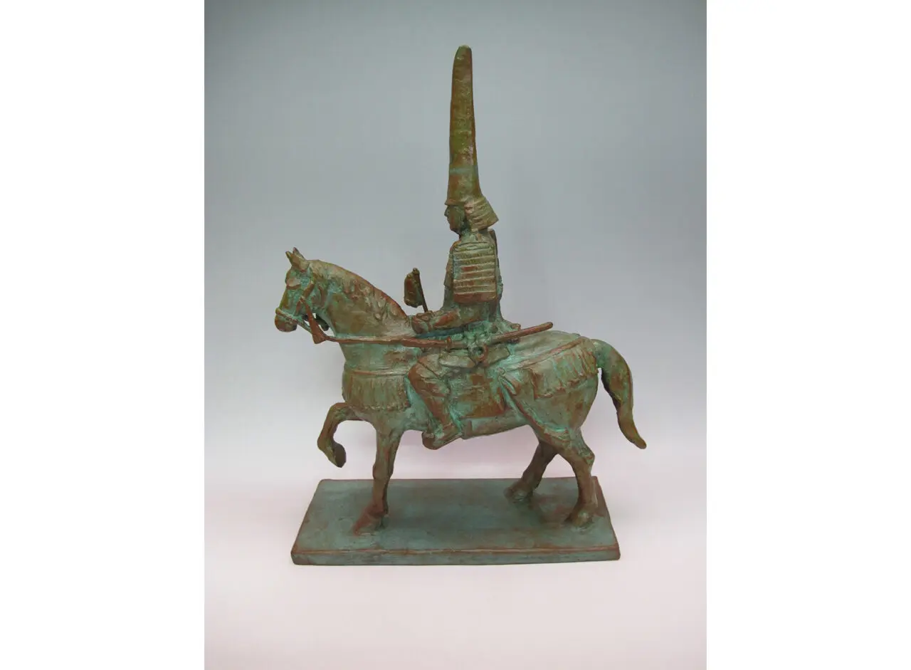 本作は、高岡開町の祖であり、市民に今も親しまれている前田利長公が、慶長14年(1609)に高岡城と城下町を開き入城した際の晴れ姿をかたどった騎馬像です。利長公の象徴である銀鯰尾形兜を被り、堂々と馬上に立つ姿は、高岡の歴史と誇りを今に伝えています。