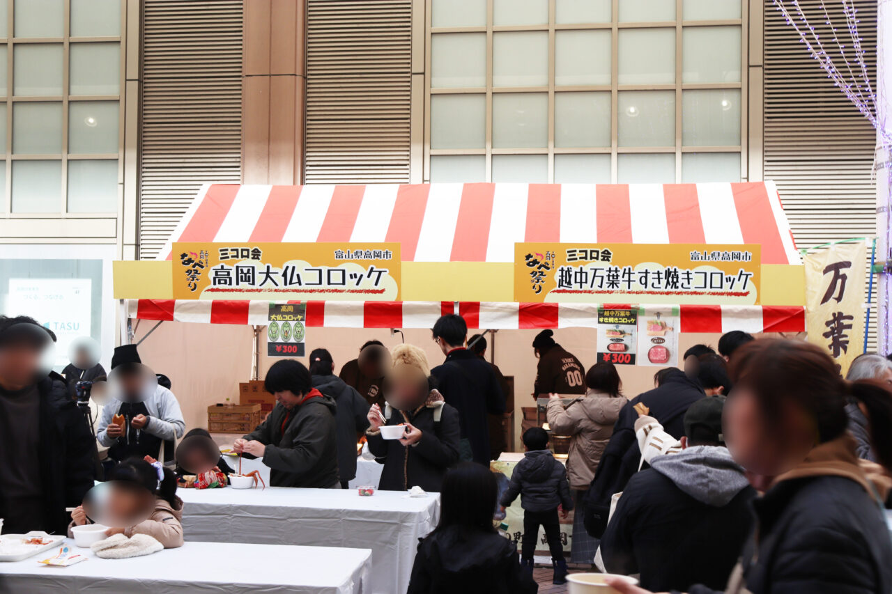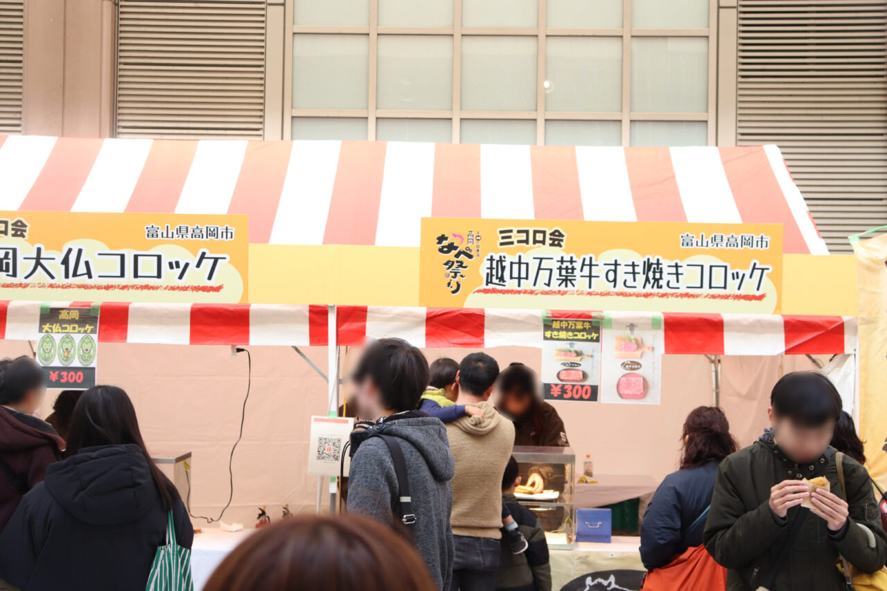そして、地元・高岡市からは「高岡大仏コロッケ」「越中万葉牛すき焼きコロッケ」という、なべ祭りならではの特別メニューが登場。こちらも早い時間から列ができ、地元の方々を中心に大きな注目を集めていました。