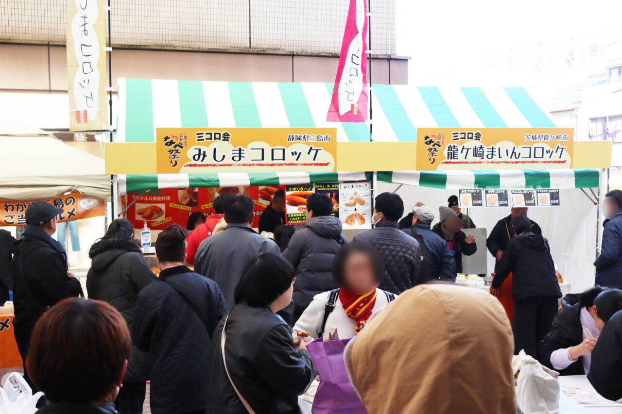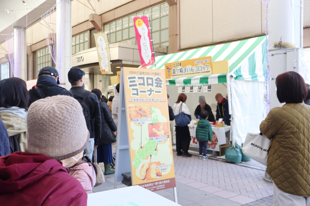 この日はなべ祭りとあわせて、コロッケでまちおこしに取り組む3市による「三コロ会」の出店も同時開催され、冬の御旅屋セリオ前においしい交流の輪が広がりました。