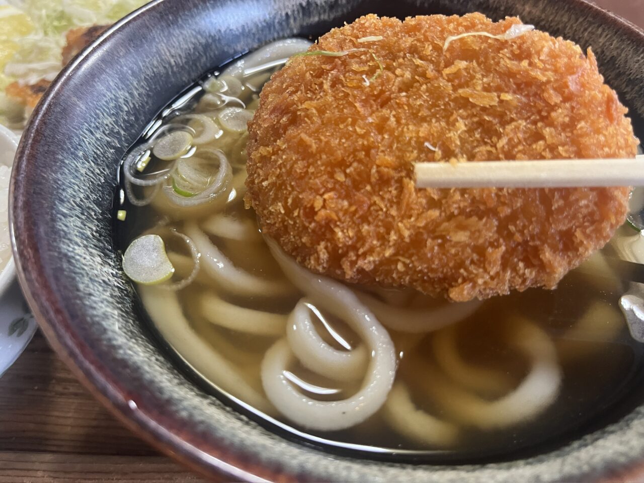そして、途中からぜひやってほしいのがコロッケをうどんに投入する食べ方。衣がほどけ、じゃがいもの甘みと油分がお店自慢のつゆに溶け出すと、一気にコクが増して、これがまた……うまい。コロッケ単体で完結させず、うどんと一緒に食べてこその定食では。この合わせ技が、定食としての完成度をぐっと引き上げています。