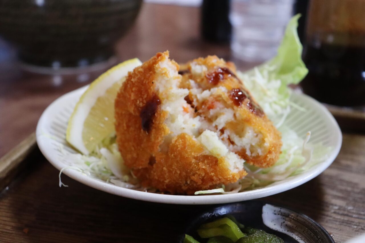 コロッケは2個、いわゆる昔ながらの、ホクホクザクザク系。派手さはないけど、衣はサクッと、中はじゃがいも感しっかり。