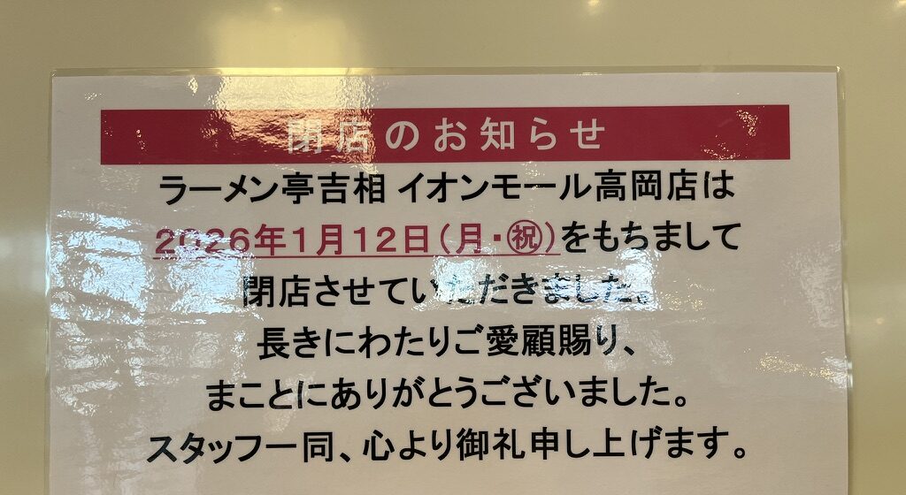 イオンモール高岡・東館レストラン街入口近くにあった新潟県に本社をもつ「ラーメン亭吉相 イオンモール高岡店」が、2026年1月12日(月・祝)をもって閉店していることが分かりました。