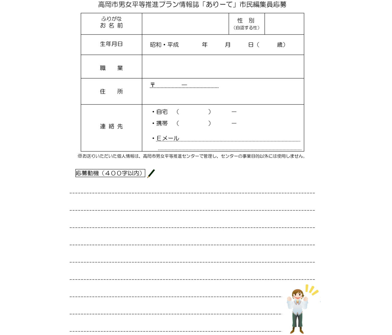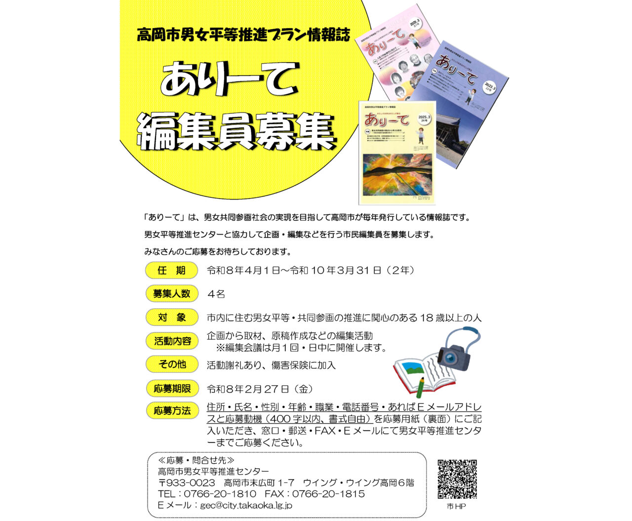 高岡市では、男女共同参画社会の実現を目指して毎年発行している情報誌「ありーて」の市民編集員を募集しているそうです。