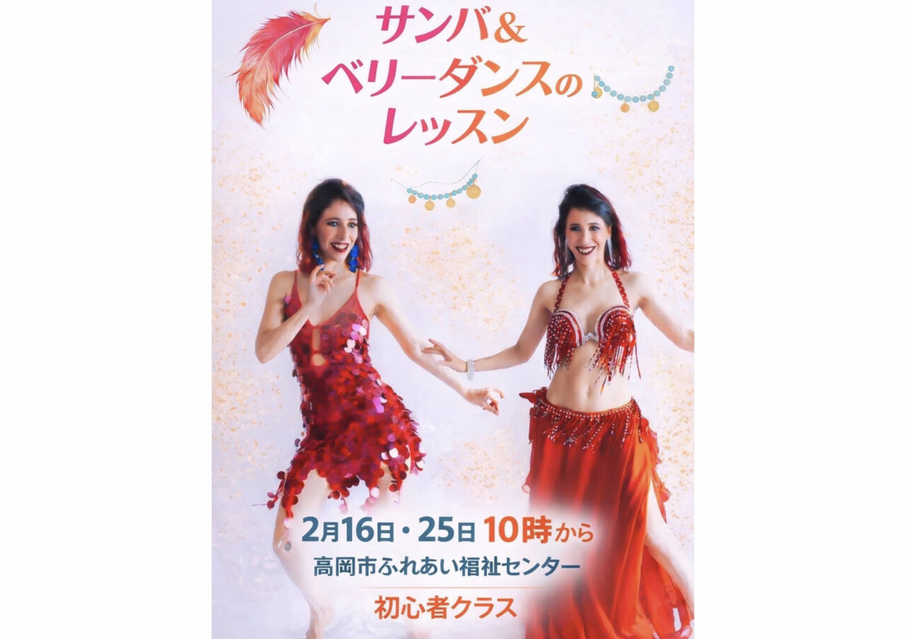 2026年2月16日(月)・25日(水)高岡市ふれあい福祉センターで、ブラジル人ダンサーのエレン先生による「サンバ&ベリーダンス エクスプレス」が開催されます。