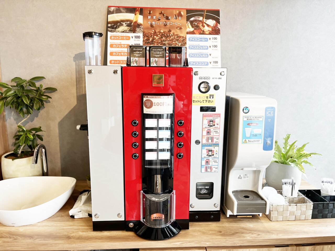 ホットコーヒー、カフェラテ、カフェモカ、ホットココア。どれも100円でほっと一息付けます。