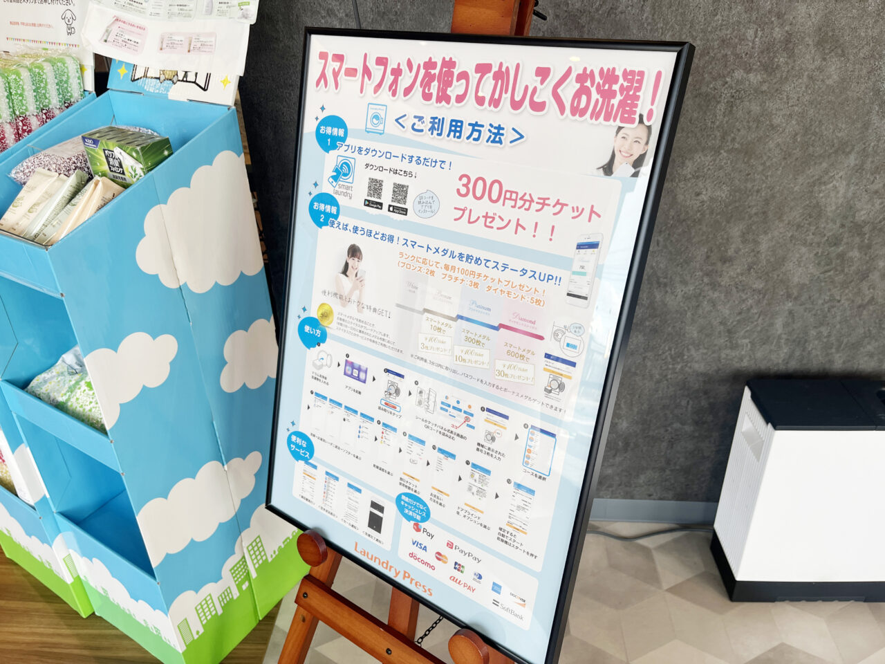スマホのアプリと連動させると、キャッシュレス支払いができ、仕上がり時間もスマホに通知が来ます。しかも初回登録時は300円分のサービスがあるので、使わない手はありませんね。