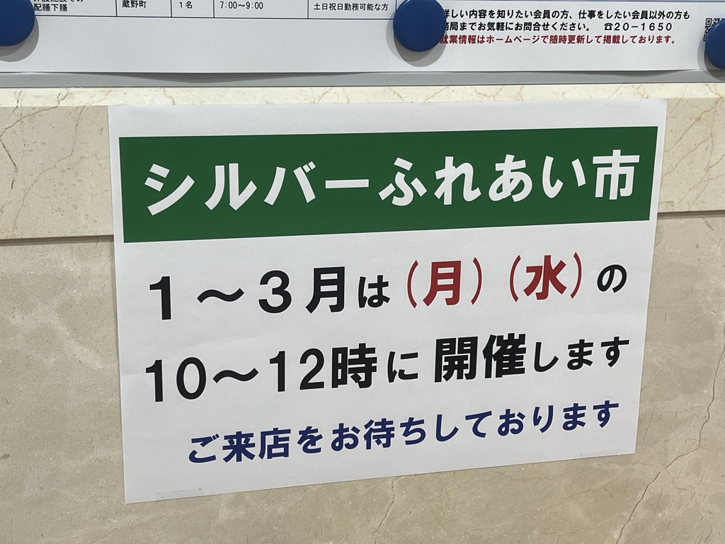 高岡市博労の「高岡市ふれあい福祉センター」で、1月〜3月の毎週月曜日・水曜日に開催されている「シルバーふれあい市」。時間は10時〜12時です。