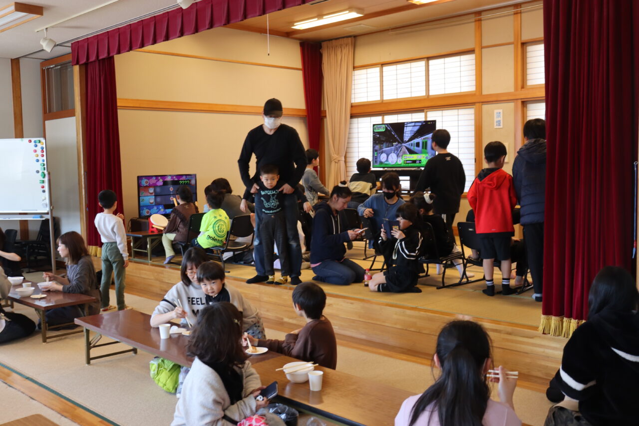 自治会やPTAによる餅つきが行われ、会場にはにぎやかな掛け声が響きました。さらに、食生活改善推進員や健康づくり懇話会の皆さんによる豚汁の振る舞いもあり、会場は大盛況となりました。