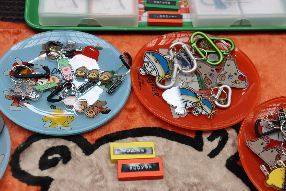そのほか、イラストレーター・いわぐちゆうこさんによるユニークなキーホルダーなどの雑貨販売もあり、「ブリのブリーフ」「仏の顔も三度まで」といった遊び心ある作品に足を止める人の姿も見られました。