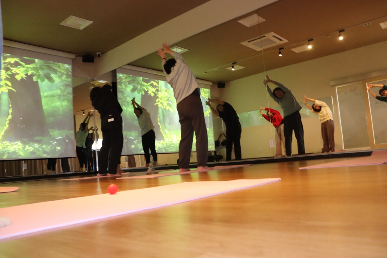 実際に中をのぞいてみると、この日はヨガインストラクター石黒優貴先生による「ゆるのびストレッチ」が行われていました。無理のない動きで体をほぐす内容で、初めての方や運動が苦手な方でも参加しやすい教室です。