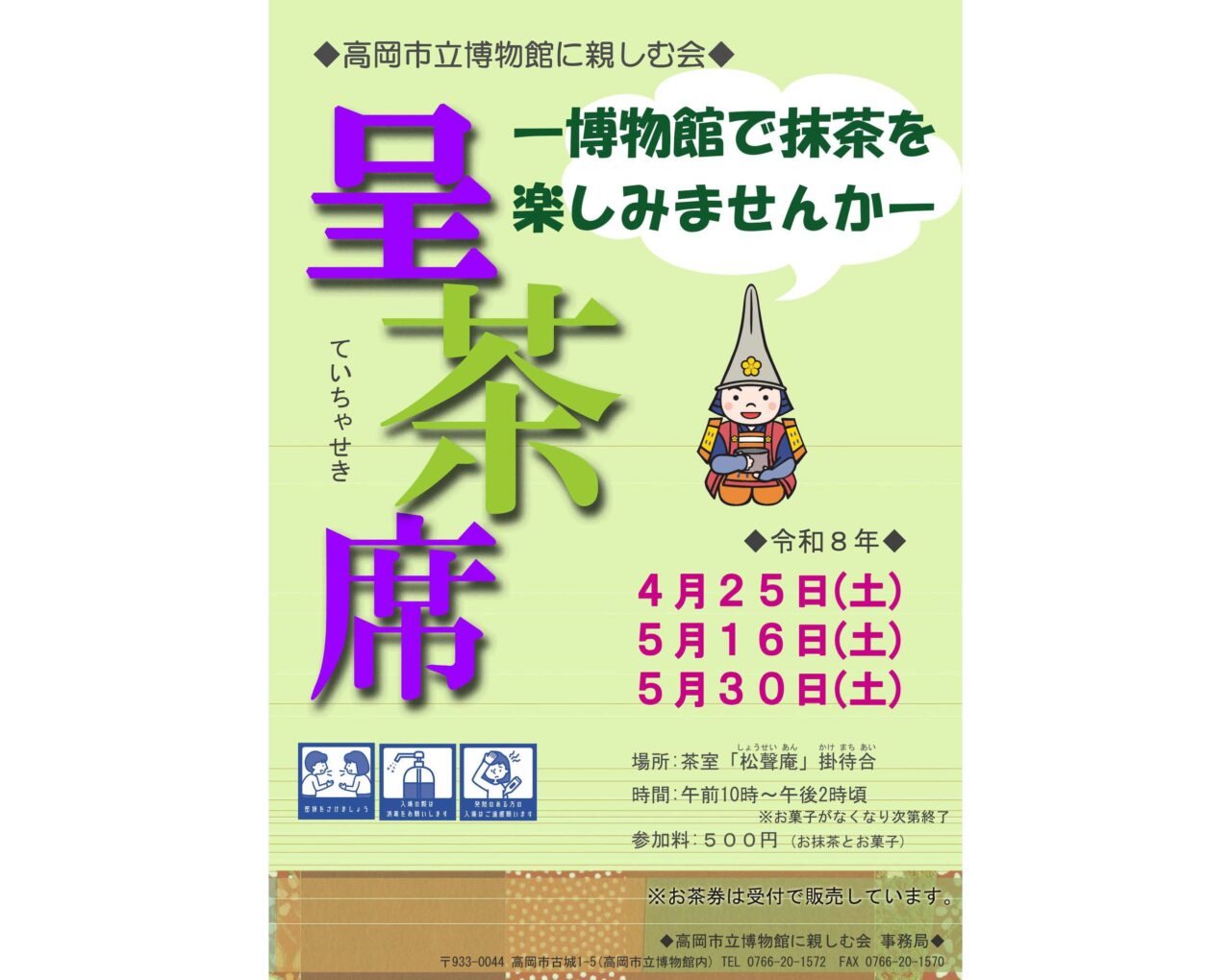 高岡市立博物館にある茶室「松聲庵(しょうせいあん)」で、春の呈茶席が開催されます。申込不要で、どなたでも参加できる気軽なイベントです。