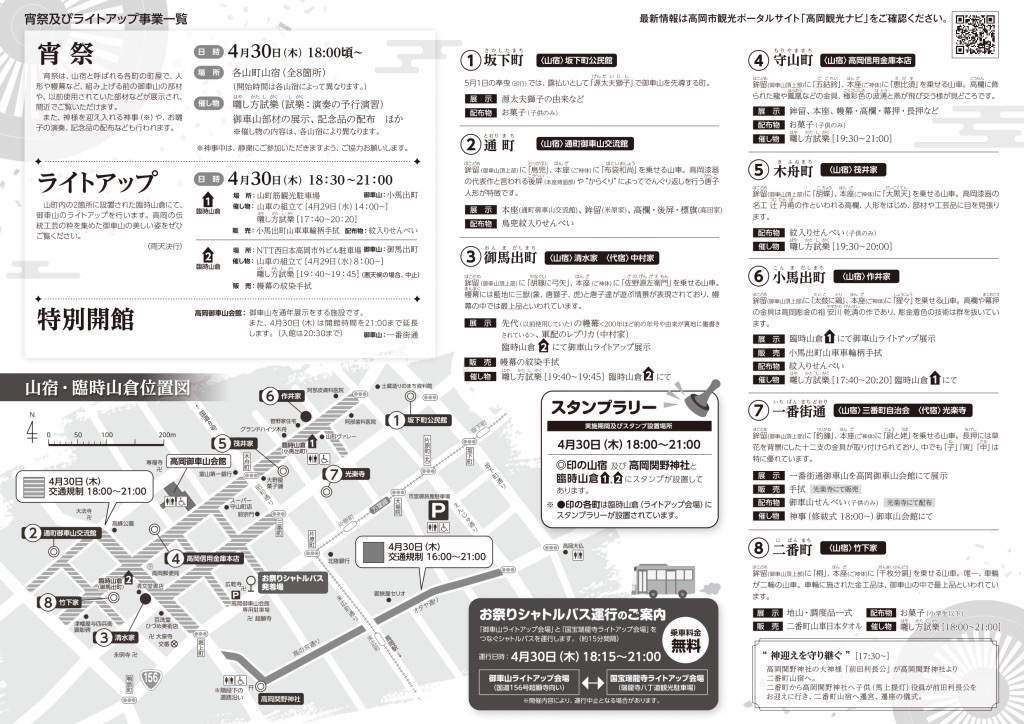 開催時間は、4月30日(木)の宵祭り・ライトアップが18時から21時まで。5月1日(金)の本祭は11時から18時までです。会場は山町およびその周辺。高岡駅から徒歩約10分と、公共交通機関でもアクセスしやすい場所です。