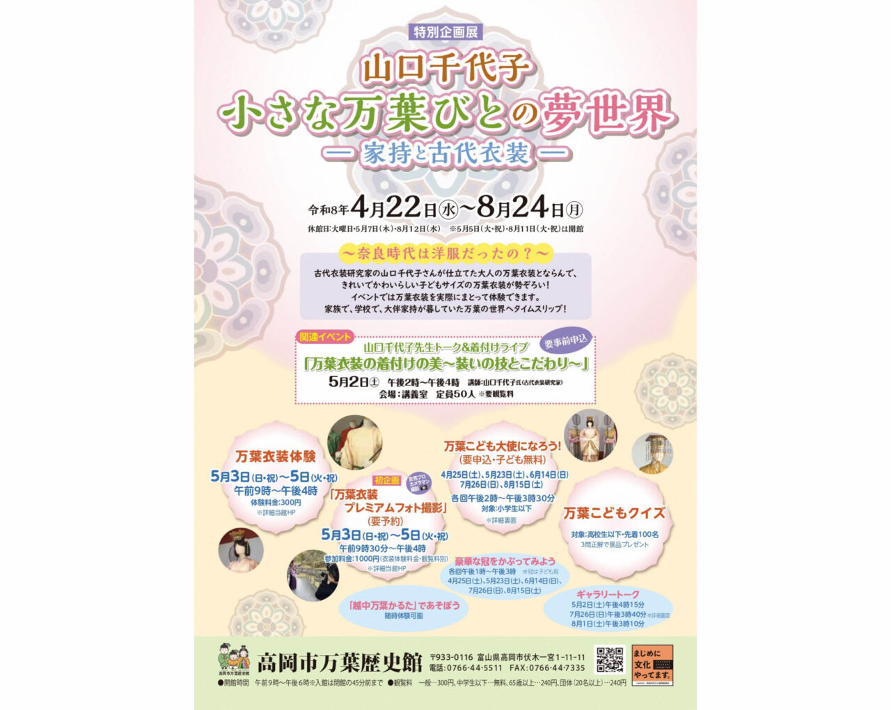 高岡市伏木一宮の高岡市万葉歴史館で、特別企画展「山口千代子 小さな万葉びとの夢世界―家持と古代衣装―」が2026年4月22日から8月24日まで開催されています。