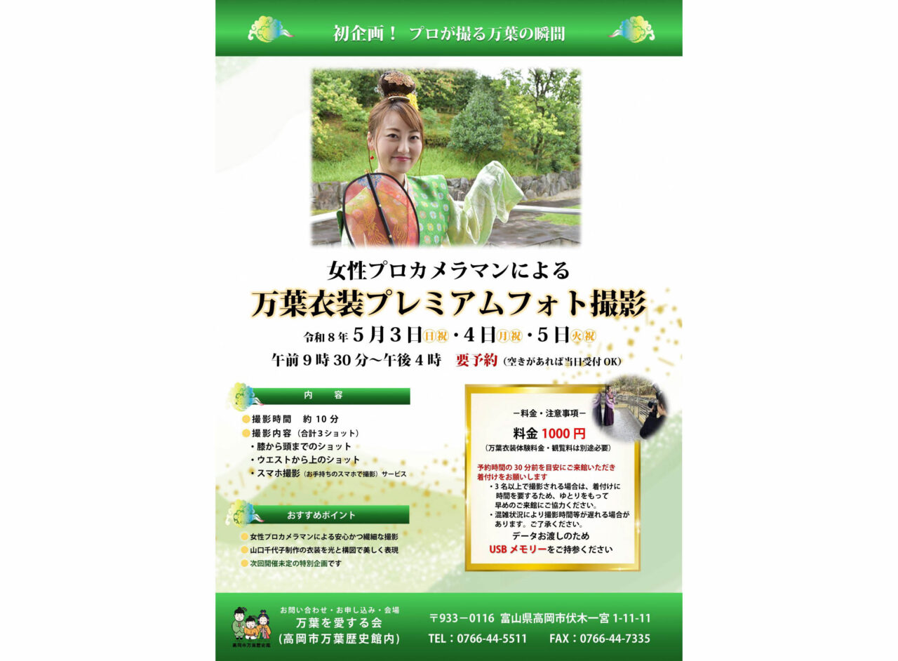 同期間には、女性プロカメラマンによる「万葉衣装プレミアムフォト撮影」も開催(要予約)。約10分の撮影で3カット撮影され、料金は1000円(体験料・観覧料別)。自分のスマートフォンでの撮影サービスもあり、記念として残したい方におすすめです。