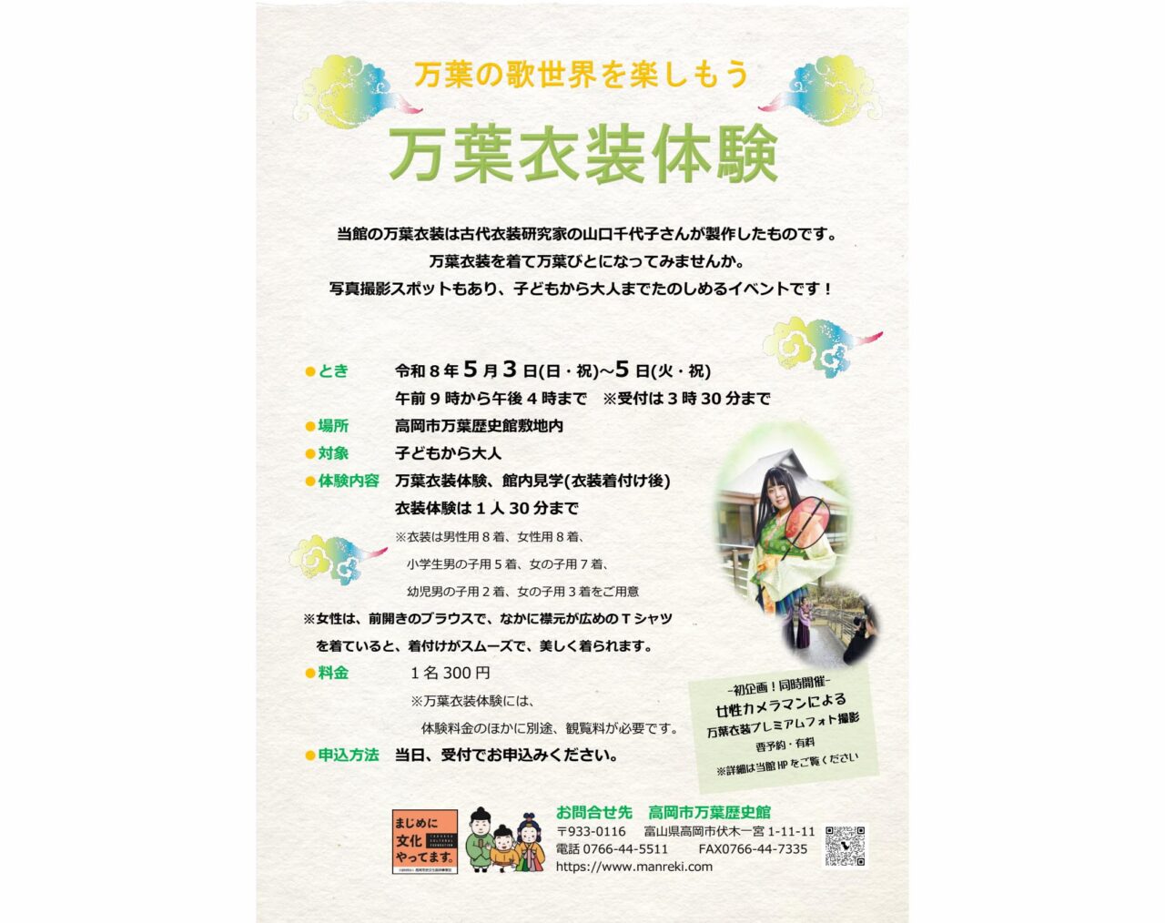 【高岡市】GWのお出かけに!万葉衣装を着て写真も!観覧300円&中学生以下無料の体験イベント